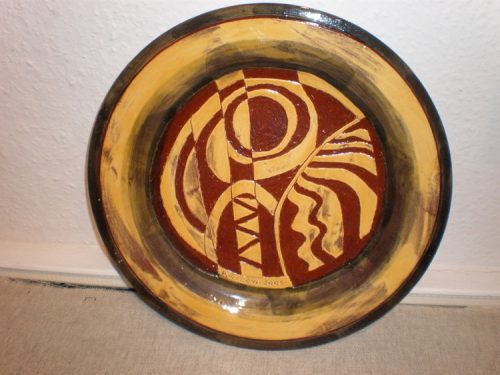 dia. 26.5cm. In 1950 the Nigerian authorities asked Michael Cardew to become 'Pottery Officer' with the aim of improving the quality of the local work. He spent most of the next fifteen years there, having set up the Pottery Training Centre at Abuja. There were exhibitions of Abuja pottery in London in 1958, 1959 and 1962, and another in Lagos in 1960. Cardew and some of the African potters, notably Ladi wali, gave lectures and demonstrations in various parts of the world and Philip Rosenthal sponsored a European tour for them in the mid-1960's. Upon Cardew's retirement from the Nigerian Civil Service in 1965 the running of Abuja was taken over by Michael "Seamus" O'Brien. O'Brien was a student of Cardew's, but had a background in painting rather than pottery. He had to learn on-the-fly, a task made more difficult when he was told that the educational subsidy for training would stop and the pottery would have to make a profit. O'Brien stayed until 1972 continuing Cardew's tradition of encouraging the potters to make their own interpretation and decoration for the simple basic shapes he had taught them. He managed to solve, or partially solve, some of the technical problems that had beset Cardew, and further problems with efficiency were also solved during O'Brien's tenure. He was concerned that the potters earned five shillings a day, an led a fairly easy life, while farmers were earning two shillings a day and had to find 2-10s once a year to pay their taxes. It was taking the kiln gang - six or seven men - three weeks to cut sufficient wood for a firing. One day he took the laziest man aside and sawed wood with him - one at each end of a bow saw - and they finished the day with enough wood for a firing. The period allowed for the gang to do the work was subsequently reduced from three weeks to three days. In this and other ways O'Brien managed to make the pottery pay its way, or appear to pay its way to the satisfaction of the government. The Abuja pottery, now known as the Dr. Ladi Kwali Pottery, Seleja, is still government ownder, still active, but without the dynamism that made it famous in its early days. The role of oil in the Nigerian economy made keeping the pottery viable less important. Development is to be found in some of the work by potters who once worked at Abuja and have now set up their own workshops. -